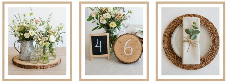 - Centerpieces: Wildflowers in mason jars, tin cans, or old pitchers. Add a wood slice underneath for extra texture.