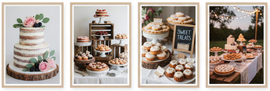 - Display setup: Use tree-slice cake stands, stacked crates, or vintage trays.