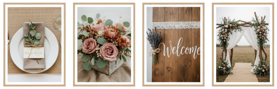 - How to use them: Mix these materials into your table runners, napkin ties, or signage to keep everything cohesive.