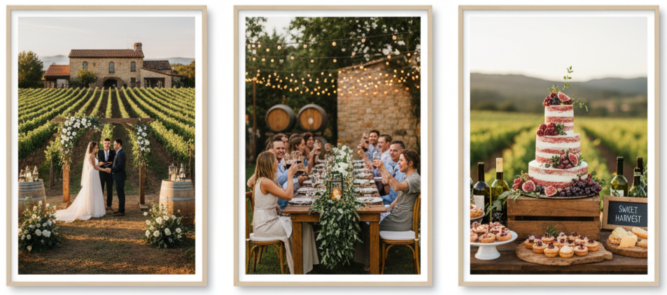 | Vineyard | Elegant rustic | Vines, rolling hills | Spring–Fall | Ideal for wine service |