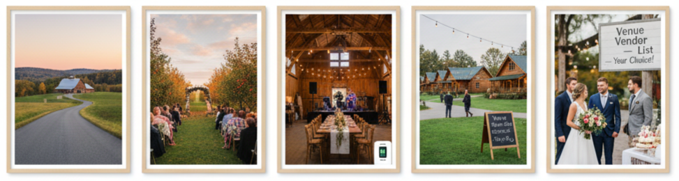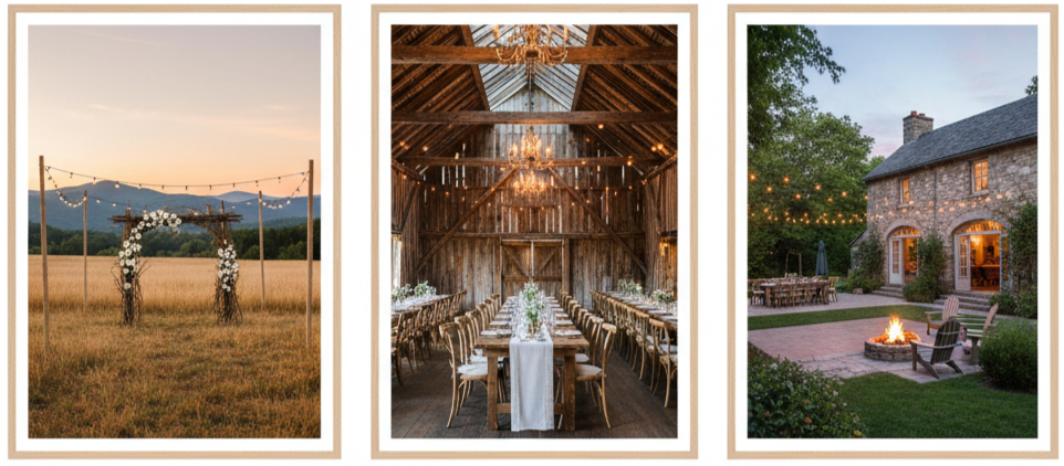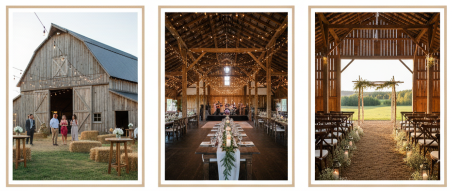 | Barn | Large gatherings | Fields, wood interiors | Spring–Fall | Indoor backup built-in |