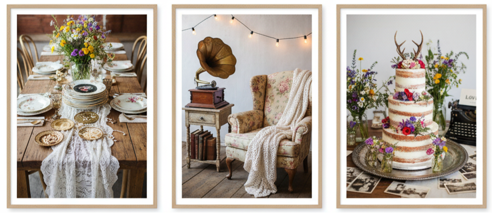 - Vintage Details: Lanterns, old books, lace doilies, antique furniture, and weathered frames add character.