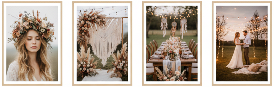 Think macramé, floral crowns, soft colors, and a relaxed vibe.