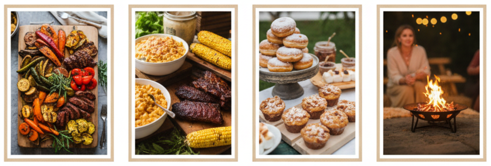 - Creative Desserts: Mini pies, donuts, cobblers, or s’mores by the fire pit make dessert fun and memorable.