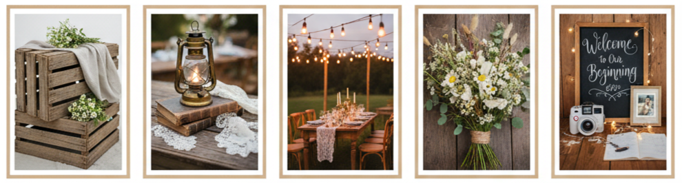 - Bouquets and Florals: Wildflowers, eucalyptus, dried grasses, and garden-style arrangements highlight the rustic theme.