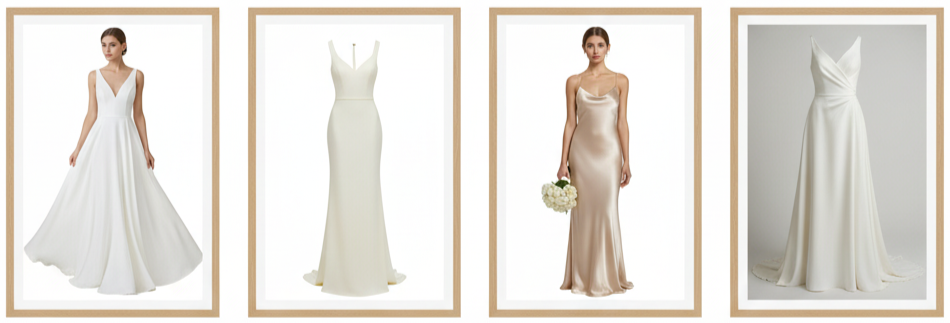 A simple wedding dress focuses on clean design, effortless elegance, and high‑quality fabric without layers of lace, sequins, or heavy embellishments. Instead of dramatic details, these gowns lean into soft structure and natural beauty. Silhouettes like A‑line, sheath, slip, and column gowns stand out because they highlight your shape without overwhelming it. Colors usually stay classic with ivory, white, champagne, or blush, while fabrics like silk, satin, chiffon, and crepe give the dress its character. Everything about a simple wedding dress feels intentional, polished, and naturally beautiful.