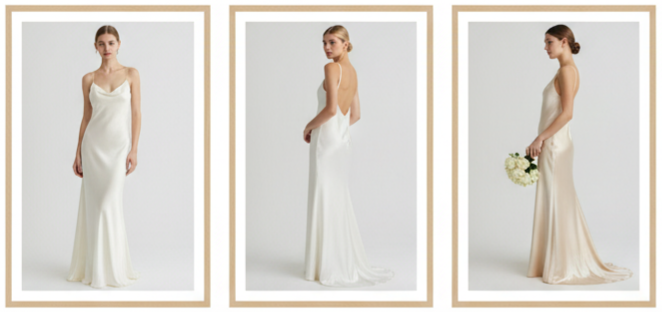 Slip dresses bring a smooth, soft drape that glides as you move. They give off a sophisticated and effortless vibe, especially for casual weddings or elopements. Sheath and column dresses offer an elegant shape that hugs the body without restricting movement. They work beautifully for beach ceremonies, garden weddings, and intimate gatherings.