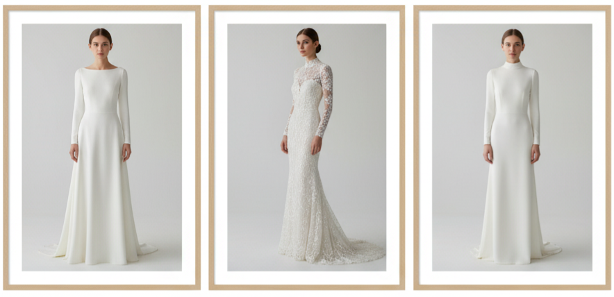 Modern minimalist gowns often use structured fabrics, sharp lines, and open backs for a bold, runway‑inspired look. They’re perfect for city weddings or contemporary venues. Brides who want a bit more softness love A‑line or empire waist gowns, which offer gentle volume and flattering shapes. If modesty or sophistication is your style, long sleeves and high necklines bring that clean, refined finish.