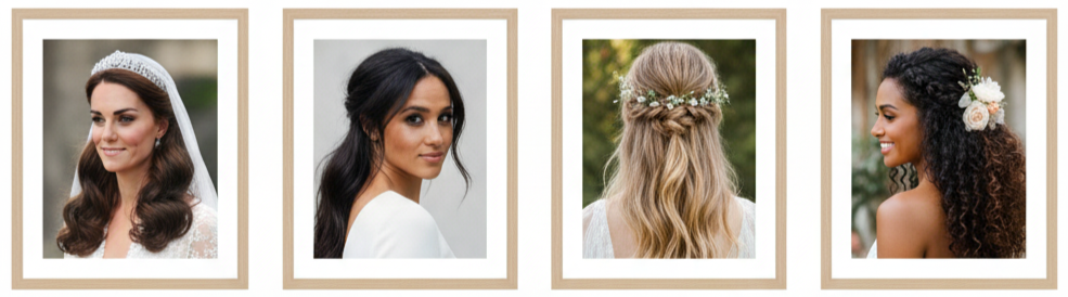 Many brides look to celebrities for inspiration when choosing a half up half down hairstyle. Kate Middleton’s sleek style with soft curls and a tiara showcases timeless elegance, perfect for formal, royal-inspired weddings. Meghan Markle’s soft waves highlight a natural yet polished approach, blending simplicity with sophistication. Bohemian variations, featuring loose waves and delicate floral accents, are popular among brides seeking outdoor, garden, or beach wedding looks.
