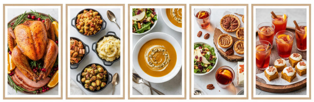 Start by choosing hearty, flavorful entrées such as roasted turkey, maple‑glazed ham, slow‑braised short ribs, or even herb‑crusted chicken. For sides, think of elevated versions of holiday favorites like gourmet stuffing, garlic mashed potatoes, roasted Brussels sprouts with pancetta, or sweet potato gratin.