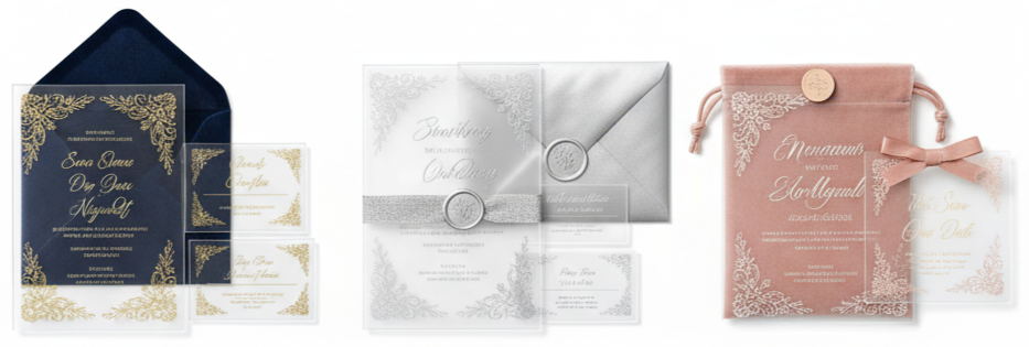 | Acrylic Invitations | Luxury & Modern | Clear or frosted plastic sheets |