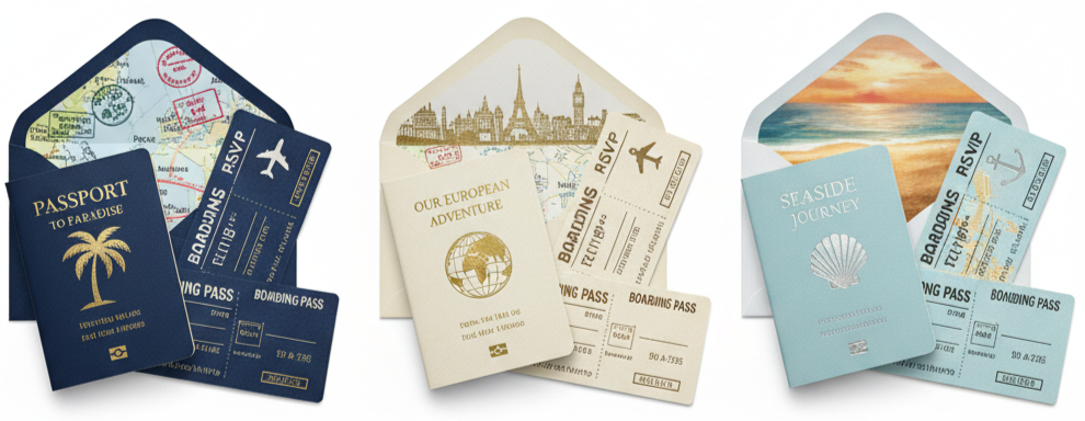 - Design ideas: Use tropical colors for beach weddings or vintage passport stamps for European themes.
