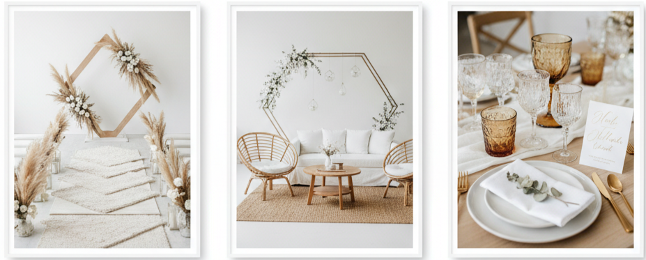 Boho weddings are known for their free-spirited style, and when mixed with modern structure, they feel fresh and creative. Think of layering textured rugs down the aisle, pairing rattan lounge seating with geometric arches, and using mismatched glassware with minimal table styling. The balance creates a relaxed yet refined atmosphere.
