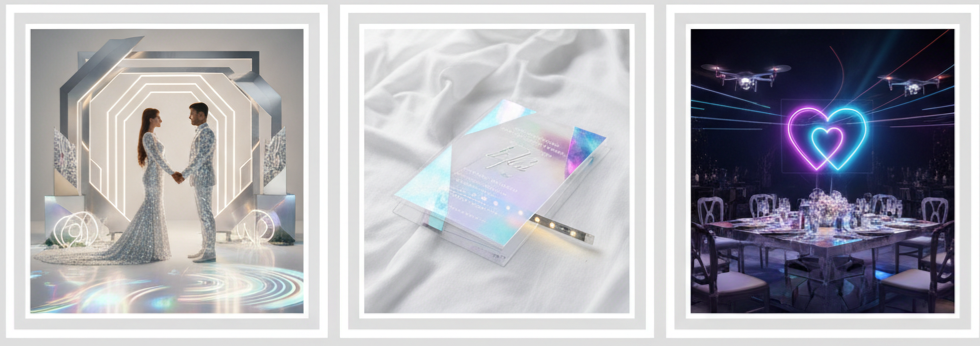 For couples who love bold statements, futuristic glam brings in drama with metallics, LED lights, and even holographic touches. Imagine mirrored centerpieces, neon backdrops, and custom lighting shows that transform the venue into an unforgettable experience. Drone footage, LED dance floors, and modern entertainment make it feel high-tech and glamorous.