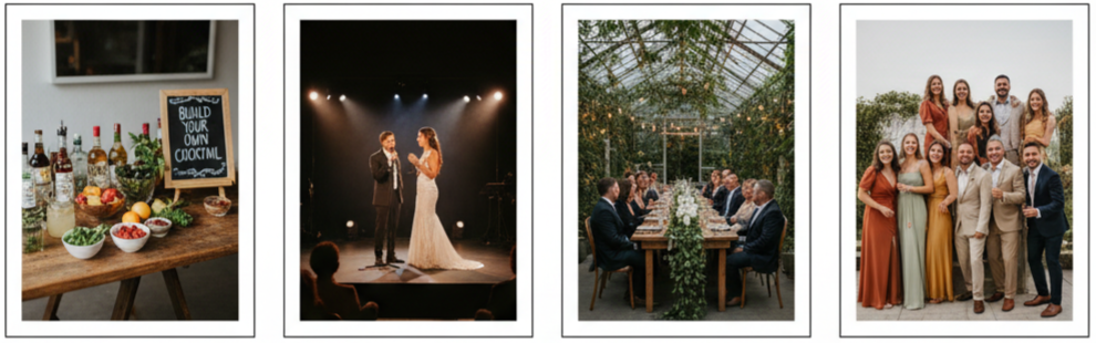 - Make It Interactive: Today’s guests don’t want to just watch—they want to participate. Fun stations like build-your-own cocktails, audio guestbooks, or handwritten message trees let people be part of your celebration. A live sketch artist can draw guests or capture special moments throughout the event, offering a unique souvenir.