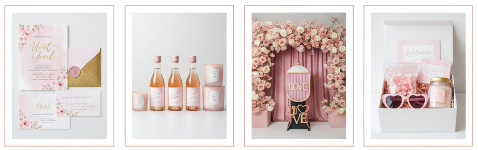 - Thoughtful Favors: Mini rosé bottles, blush-scented candles, or custom-made sachets are practical and memorable.