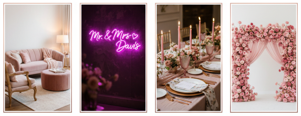 - Statement Lighting: Neon pink signage featuring your names or a favorite phrase instantly adds personality and photo-worthy flair.