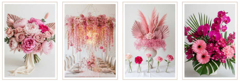 Florals bring your pink theme to life. From soft pastels to bold arrangements, flowers set the tone for your ceremony and reception.