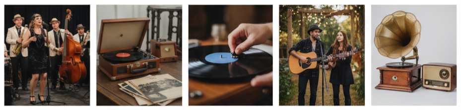 | 1930s–40s | Satin, long sleeves | Big Band, Crooners | Elegant, soft lighting |