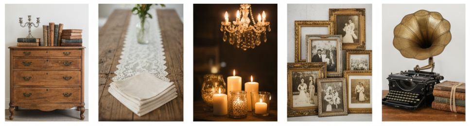 A vintage wedding’s charm lies in the details. The goal is to make guests feel like they’ve stepped back in time, surrounded by history and romance. You don’t need to buy everything new—mixing old and repurposed items adds authenticity.