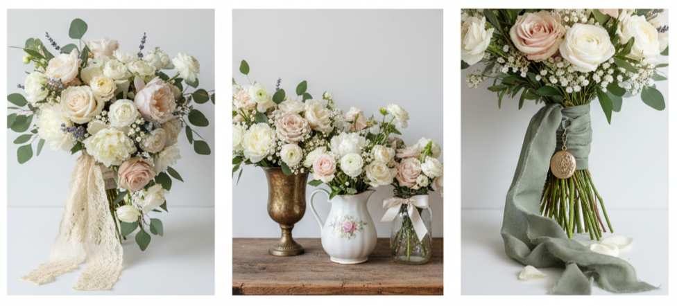 Flowers play a big role in tying your vintage theme together. Focus on soft, romantic colors and traditional blooms. Garden roses, peonies, ranunculus, and baby’s breath work beautifully in shades like ivory, blush, sage, and dusty lavender.
