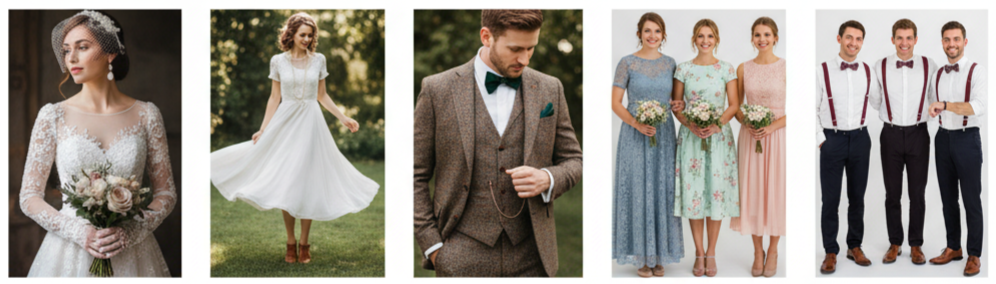 Fashion is where the vintage vibe really comes alive. For the bride, it’s all about choosing a dress that nods to a classic era. Long lace sleeves, illusion necklines, and beaded bodices capture the essence of elegance. A tea-length dress is perfect for a 1950s garden celebration, while flowing fabrics and pearl accessories fit the 1930s style. Pair your gown with a birdcage veil or gloves for that extra nostalgic touch.