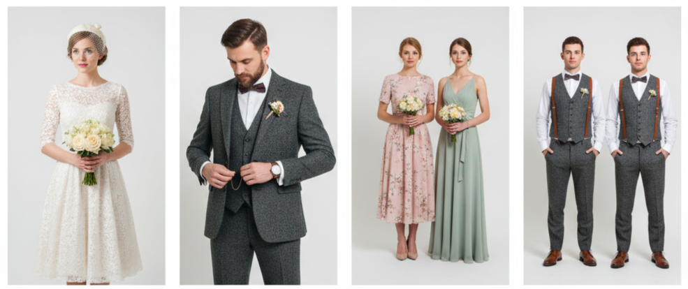 - Groom’s Style: Tweed or wool suits in shades of brown or gray create a timeless appeal. Add suspenders, bow ties, or a pocket watch to keep the theme alive.
