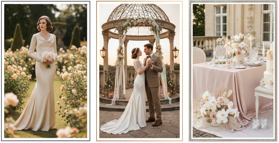 | 1930s–1940s | Satin, lace, structured suits | Pastels, champagne | Gardens, estates |