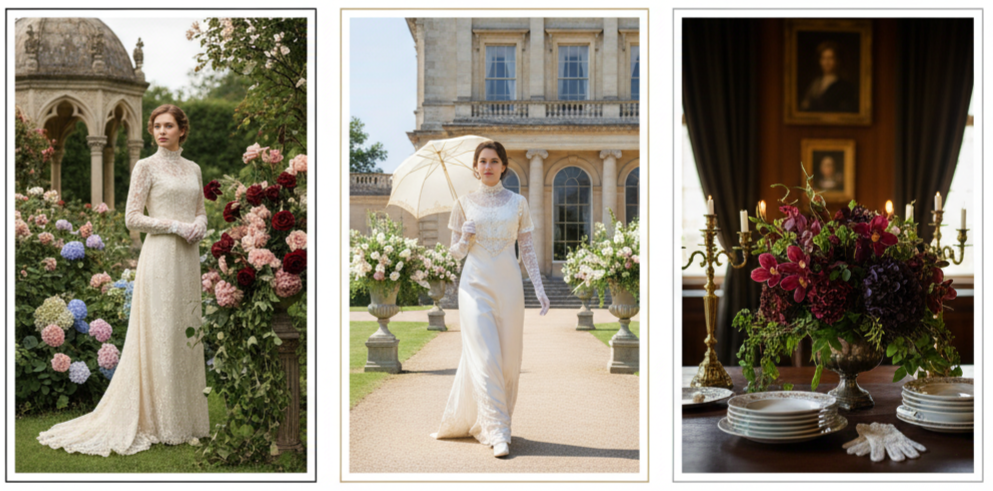 | Victorian | High-neck gowns, lace gloves | Ivory, blush, sage | Gardens, manors |