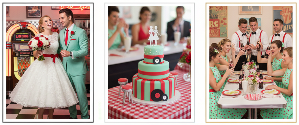 If you’re into bold colors and playful style, the 50s are a fun option. Tea-length dresses, mint greens, cherry reds, and jukebox-inspired decor fit right in.