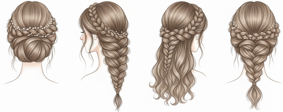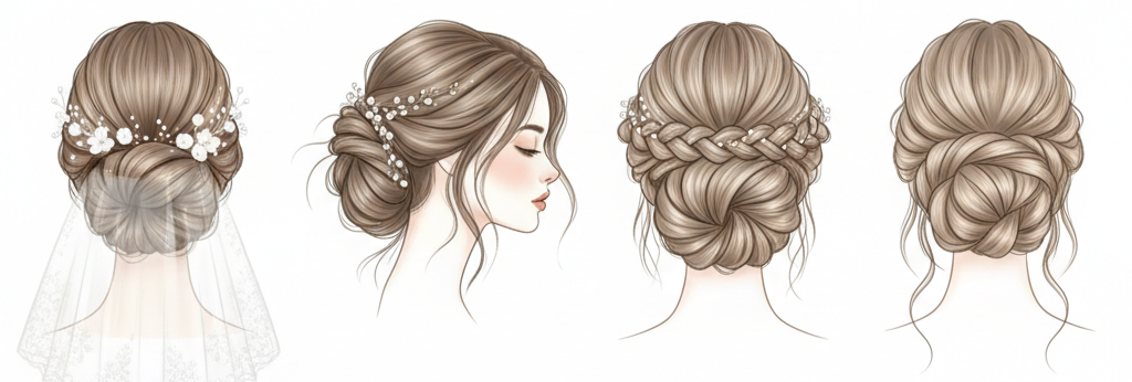 - Braided Bun: Braids woven into a bun add detail without needing long hair. A side or halo braid wrapped into a central bun works well and feels lightweight.