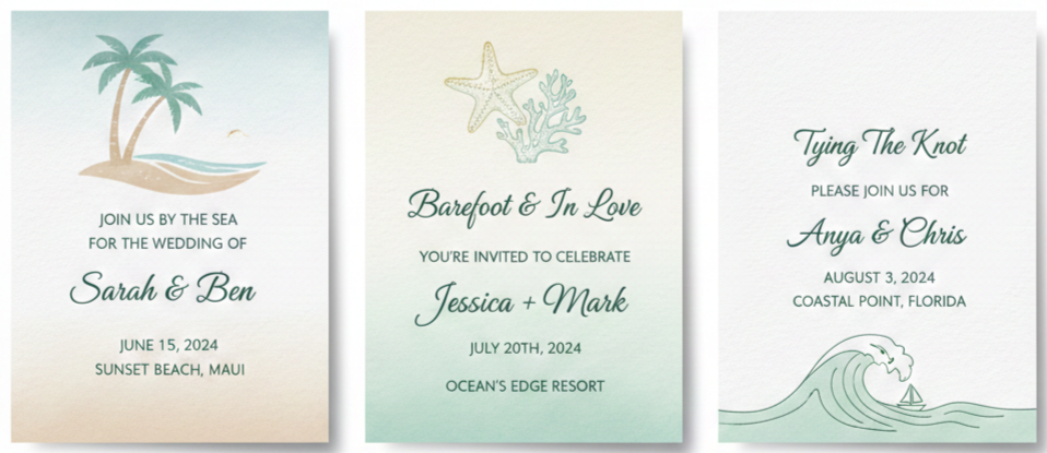 Light colors and minimal layouts match the airy feel of coastal weddings.