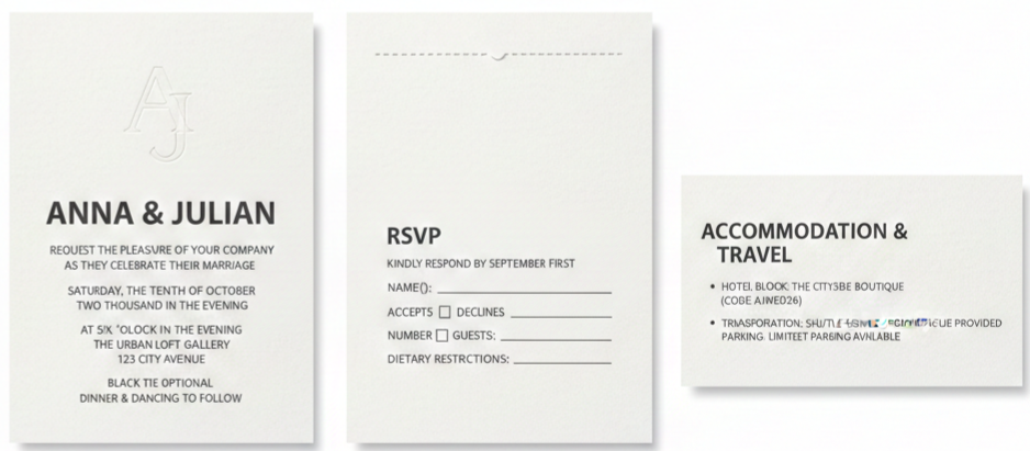 - Suite Add-Ons: Many couples add RSVP cards, details cards, map inserts, or reception cards in a matching style.