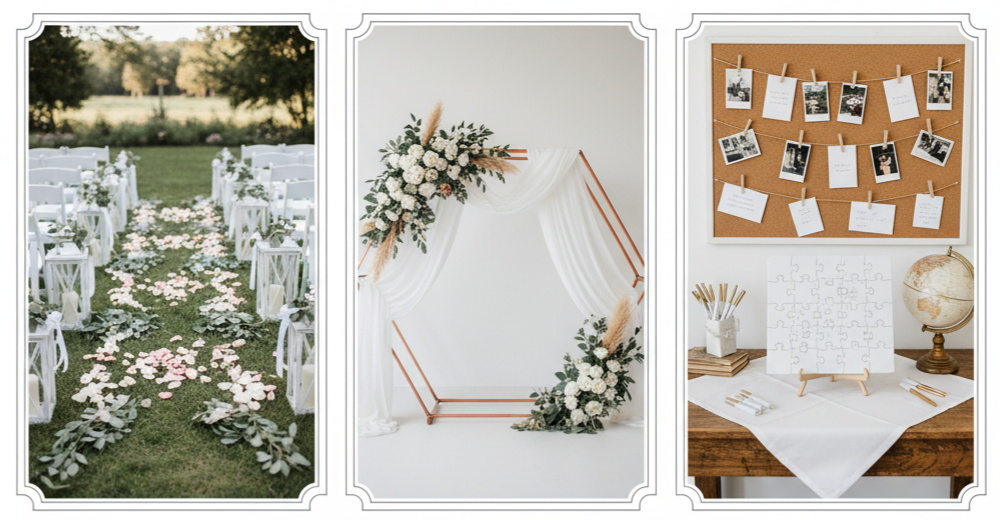 - Creative Displays: A vintage writing desk makes a charming guest book station, while old doors or velvet drapes create romantic backdrops.
