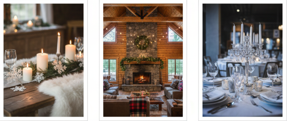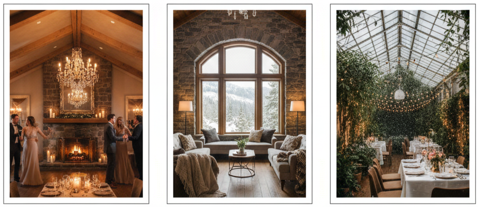 - Practical considerations: You’ll want somewhere with good heating and elegant lighting to keep guests comfortable and the mood romantic. Also, check the venue’s accessibility and parking in case of snow.