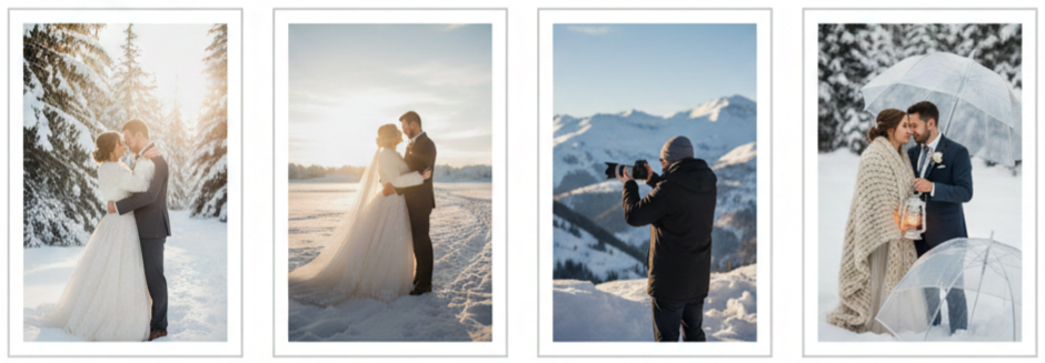- Photographer selection: Work with a photographer who’s experienced with winter weddings so they know how to use natural light and handle the elements.