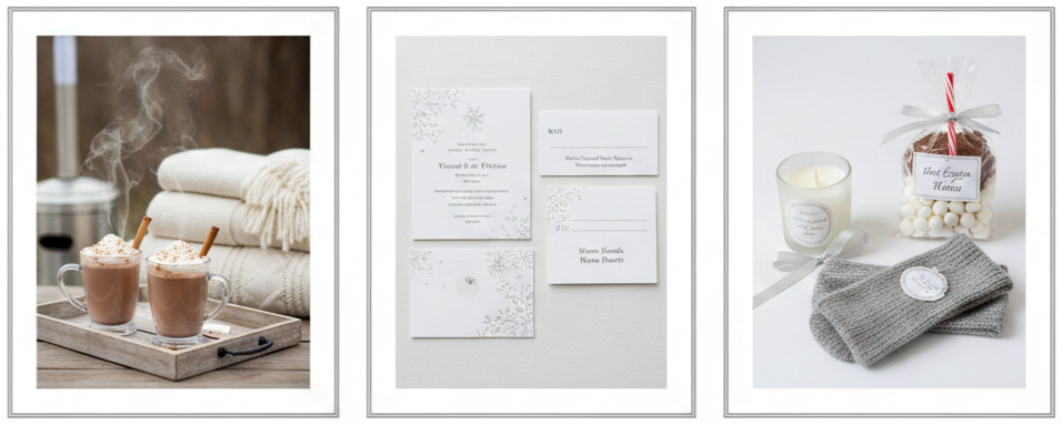 - Thoughtful favors: Personal touches like winter-themed favors—think mini candles, hot drink kits, or hand warmers—add to the seasonal experience and show you’ve thought of everything.