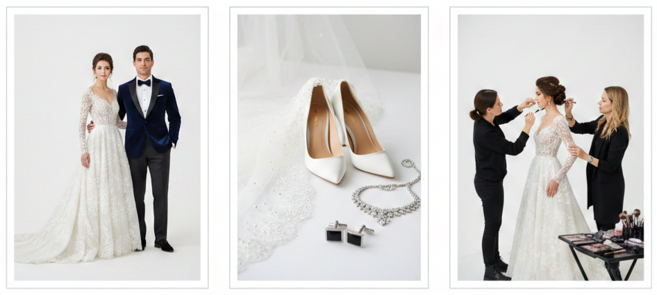 - Style every detail: Think beyond the dress or tux—veils, shoes, jewelry, and accessories should all tie into your look. Every piece plays a part in the overall image.