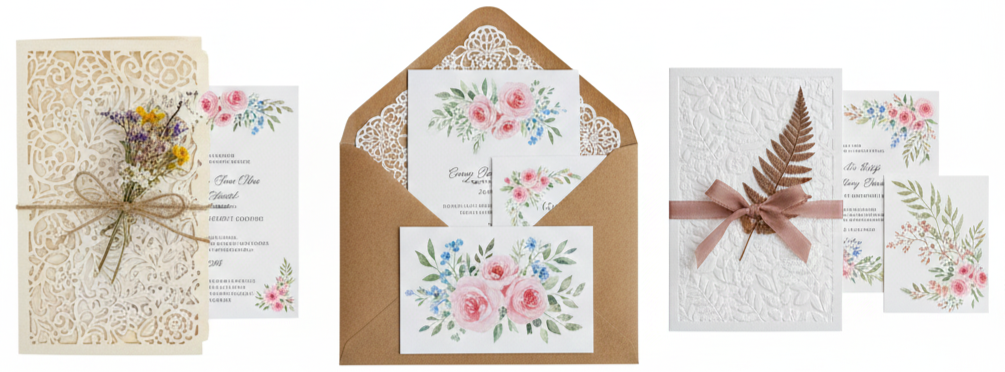 - Custom Printing: You’re able to choose your preferred fonts, colors, foil stamping shades, and design elements. Metallic foils such as gold, silver, and rose gold are available for couples who want a bit of shine.