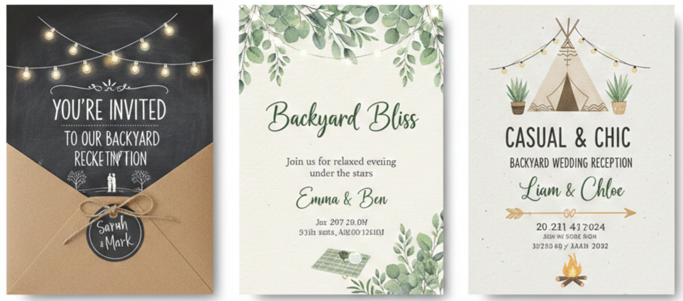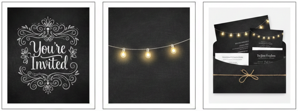 If you’re dreaming of a rustic wedding, this invite is right up your alley. It works beautifully for barn weddings, garden receptions, or even a cozy celebration in your own backyard. The chalkboard and string lights combo gives off a relaxed, intimate vibe that fits evening ceremonies especially well.