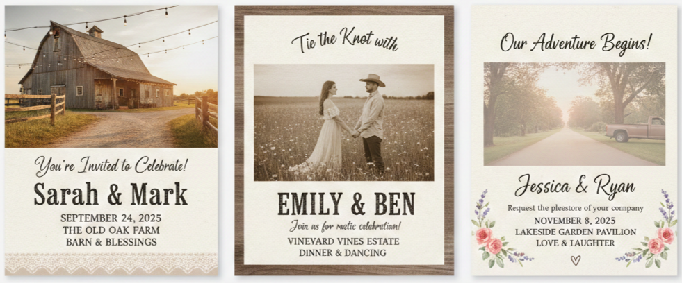 - Rustic details: These invitations often include elements like woodgrain, floral accents, lace borders, and natural textures.