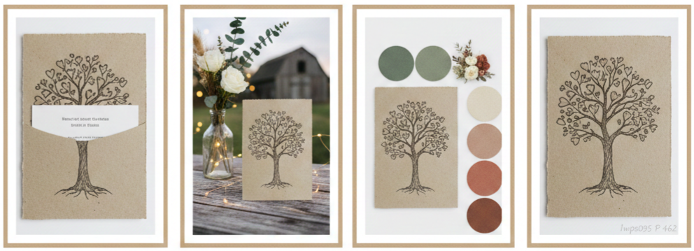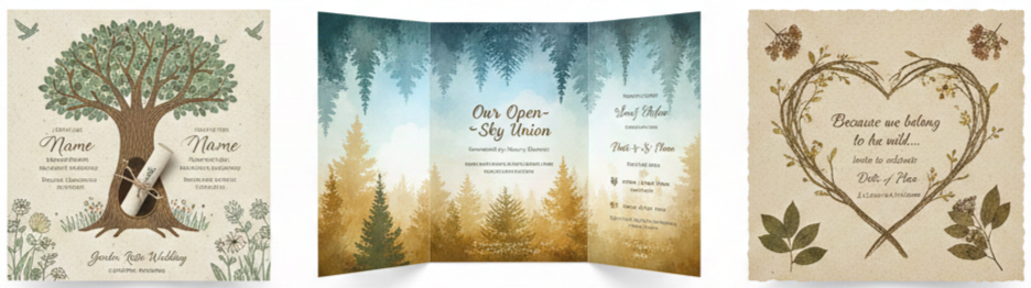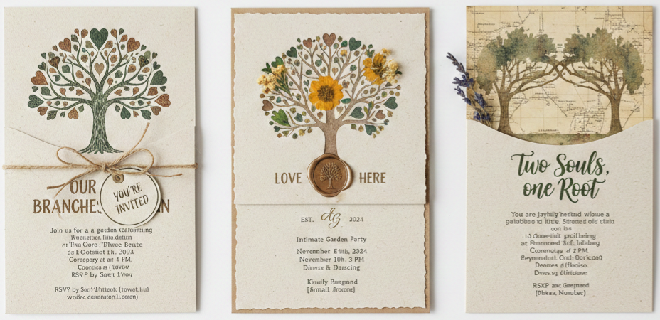 - Save-the-Date Cards: Match the invite’s rustic charm with coordinating save-the-dates. Carry the tree motif and color palette through to build anticipation.