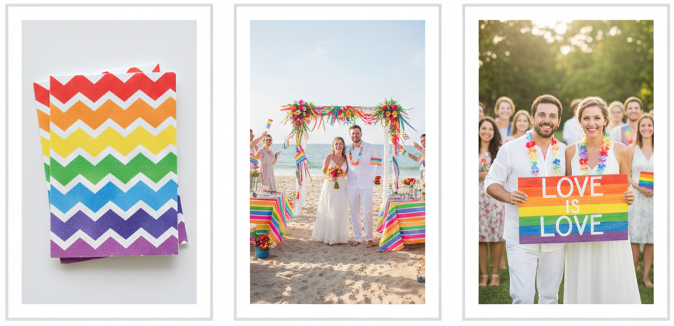 - Beyond LGBTQ+ weddings: The cheerful color palette also makes it great for anyone planning a fun, non-traditional wedding. Garden ceremonies, beach weddings, and backyard receptions all match perfectly with this colorful style.