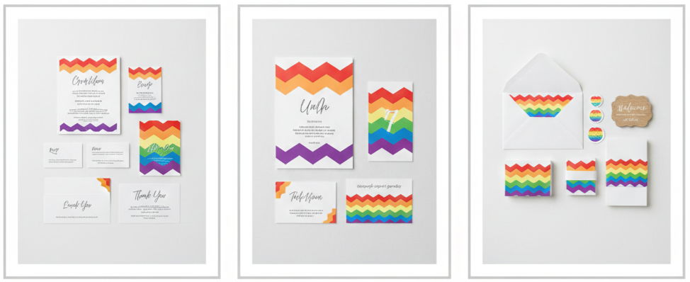 Yes, many shops offer a full suite of matching wedding stationery, including thank-you cards, menus, and signage in the same chevron rainbow style.