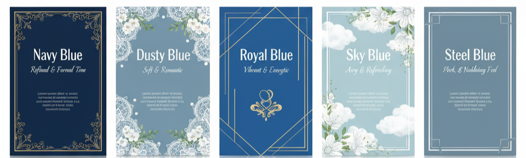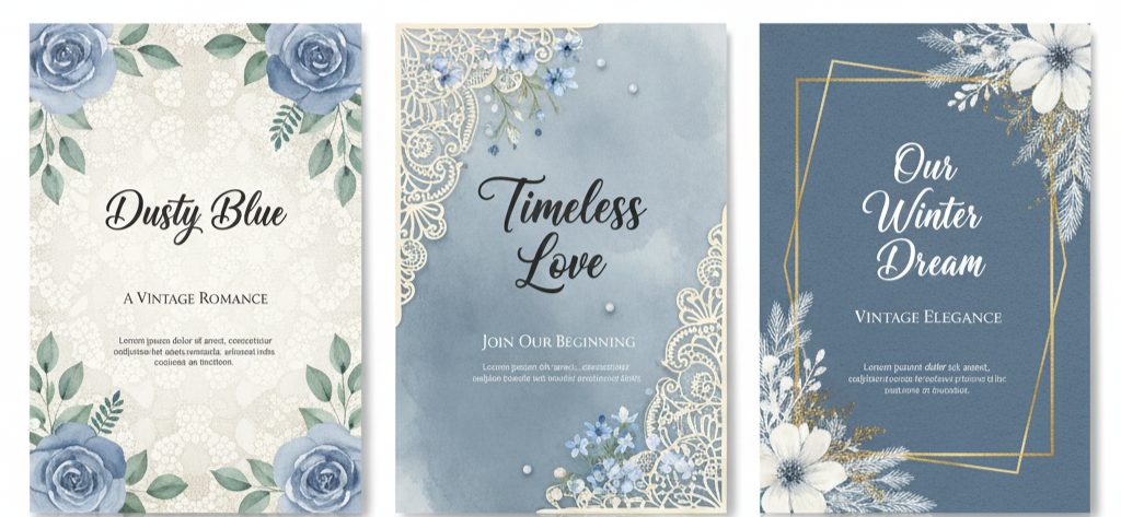 For a nostalgic look, pair dusty blue with soft calligraphy, lace textures, or watercolor floral patterns. These details add charm and elegance.
