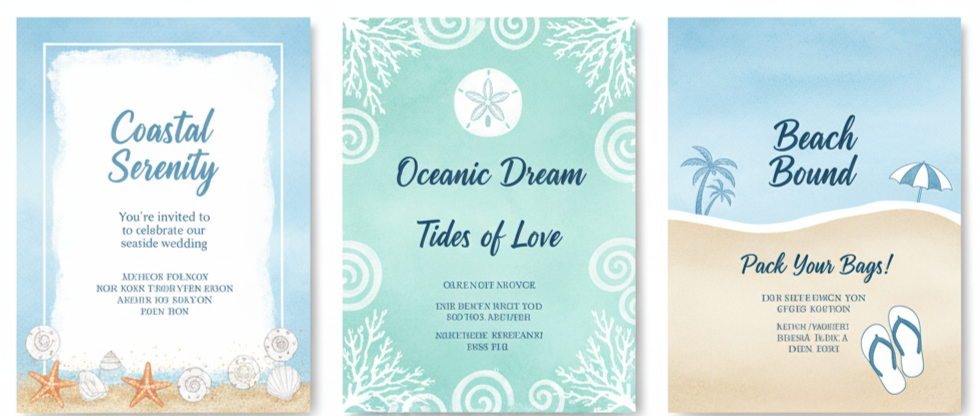 Lighter shades like aqua and sky blue look beautiful for destination or seaside weddings. Add seashell designs, watercolor waves, or sandy tones to complete the look.
