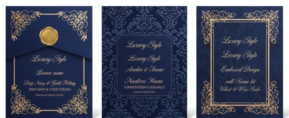 When you want something that feels high-end, deep navy with gold or rose gold foiling delivers instant sophistication. Embossing, velvet textures, or wax seals make the suite even more elegant.