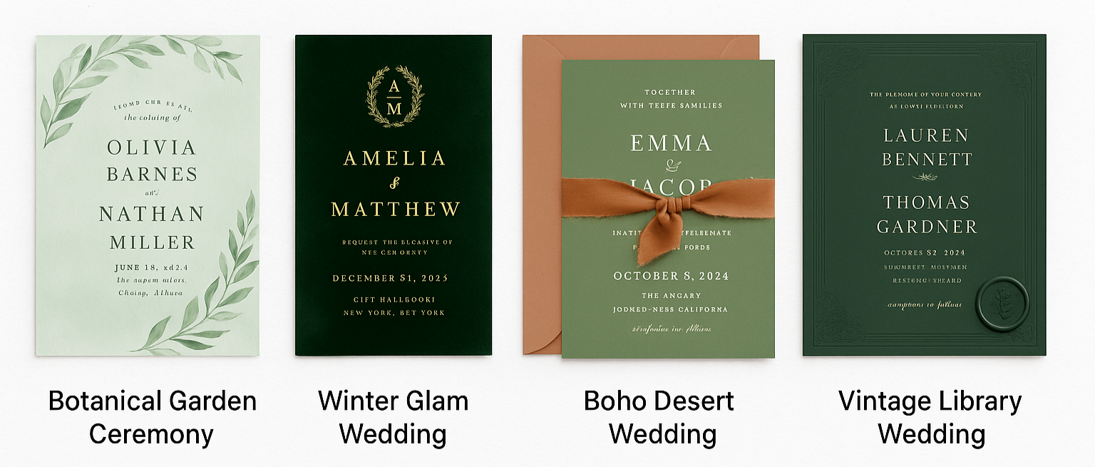 - Vintage-Inspired Prints: Think textured paper, wax seals, and traditional patterns in green. These work well for classic, romantic, or historical wedding themes.
