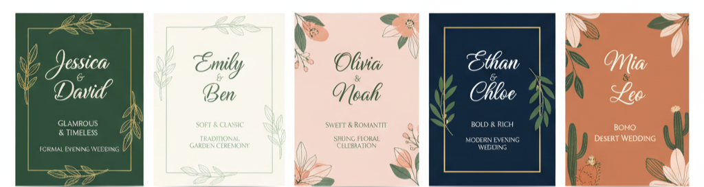 - Typography Choices: Serif fonts feel formal and classic. Handwritten or script fonts add softness and romance. Pick a font that reflects your overall wedding vibe.