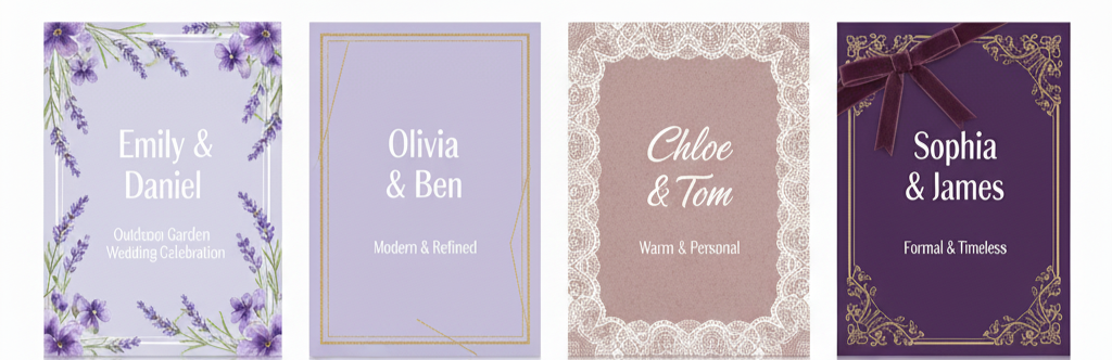 - Minimalist & Modern: Lilac backgrounds, clean fonts, and subtle foil accents create a contemporary, refined look.